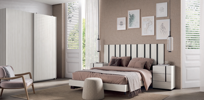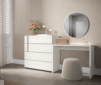 Dormitorio matrimonio que aporta dinamismo y un aspecto fresco a la estancia con una zona de estudio o tocador con espejo redondo integra una cómoda de 4 cajones creando un espacio versátil y armonioso colores a elegir