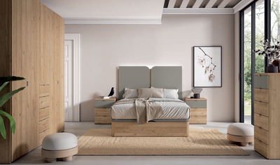 Un dormitorio lleno de carácter, el cabecero aporta suavidad y dinamismo al espacio. El armario de 5 puertas y 5 cajones ofrece soluciones de almacenaje practicas y versátiles, combinando funcionalidad y estilo en cada detalle. - Luz led opcional integrado en el propio cabecero en la parte posterior