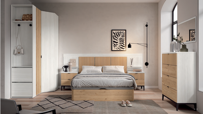 Dormitorio con diseño y elegancia acabados naturale y rayado. Su combinación con patas y tiradores en grafito aporta un estilo nórdico y actual, creando un ambiente acogedor y lleno de personalidad en el dormitorio. Armario roncón con zapatero incorporado interior efecto cuero, muy luminoso y con gran capacidad. El rayado destacaca por su aspecto natural su novedoso diseño lineal acorde a las tendencias actuales